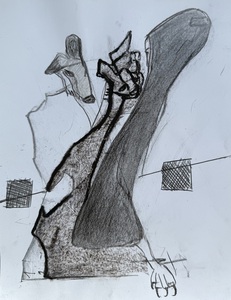 2023Vloeibaar houtskool, ArtGraf krijt en potlood op schetspapier.